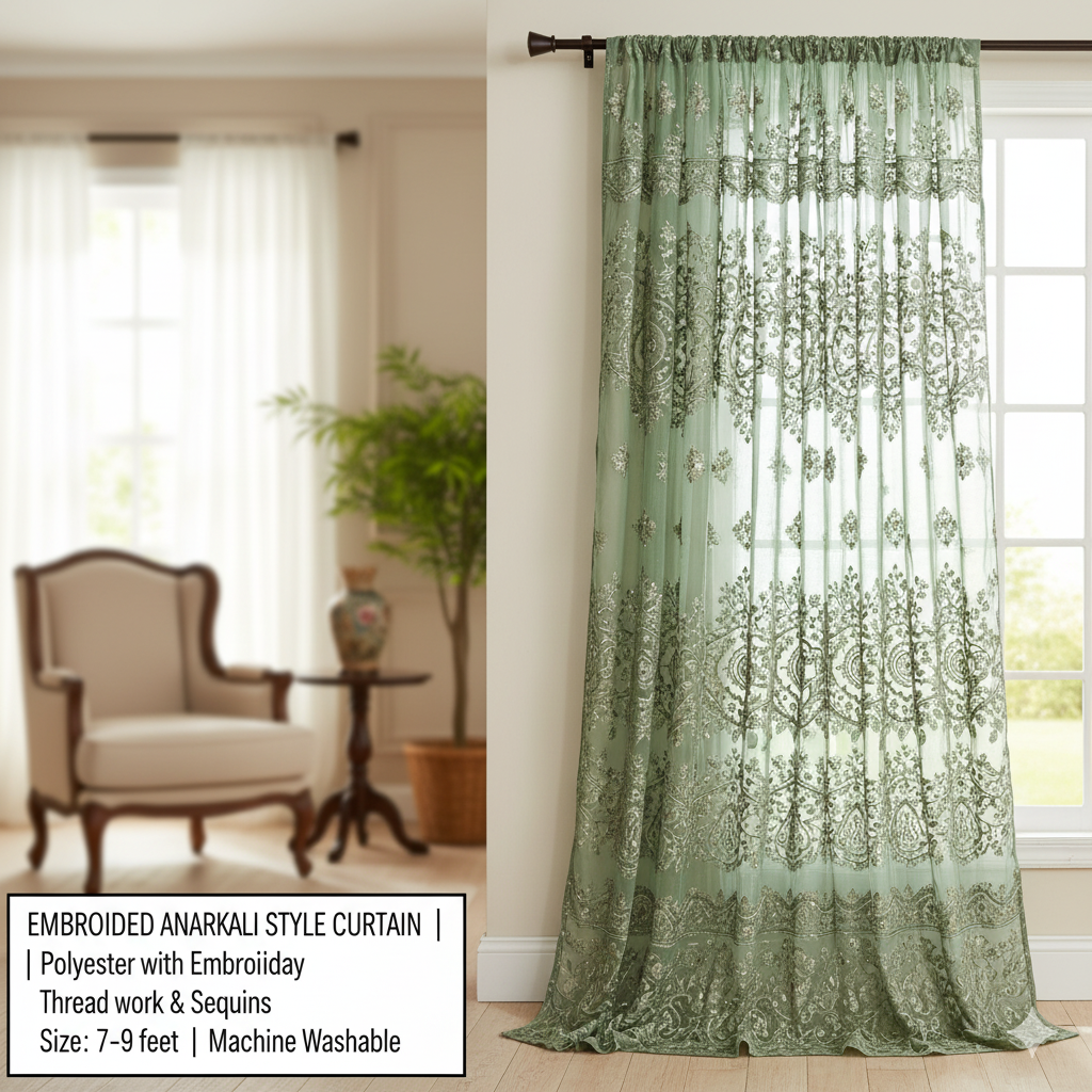 Premium polyester embroidered curtain 130 GSM featuring traditional Anarkali-inspired design with intricate embroidery throughout. Features semi-transparent fabric with embroidered motifs, rod pocket heading, and elegant drape. Material: Polyester with embroidery. Embroidery: Thread work and sequins. Colour: Sage Green. Sizes: 7-9 feet. Care: Machine wash cold 30C gentle cycle. Do not bleach. Tumble dry low or line dry. Iron on medium heat if needed. Design: Traditional Anarkali patterns with modern embroidery. Perfect for traditional and eclectic interiors. Manufactured in India exclusively by TradeFurnish.