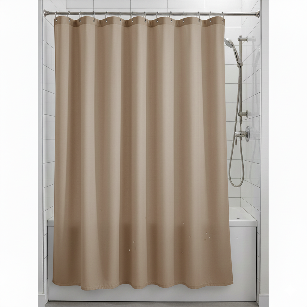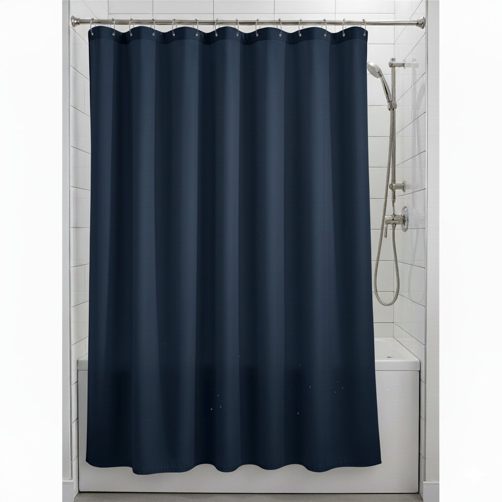 Polyester 170 GSM with extended length for taller shower spaces. Water-resistant, mold-resistant. Material: Polyester. Colour: White, Light Grey, Taupe, Navy Blue. Sizes: Extra Long 72×84 inch. Care: Machine wash cold. Tumble dry low. Features: 12 reinforced grommets, weighted hem, extra 12 inches length. Mold and mildew resistant. Perfect for tall showers, high ceilings, modern bathrooms. Made in India.