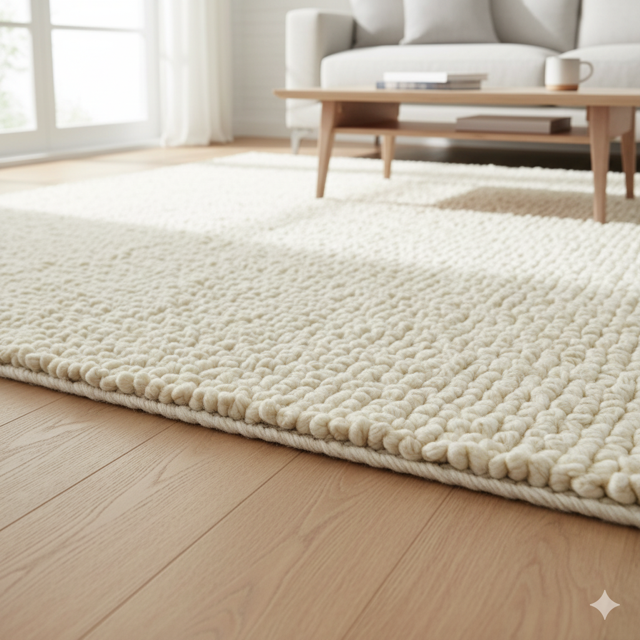 Premium 100% wool 2000 GSM, hand-tufted construction with dense pile. Plush texture with excellent durability. Material: 100% wool, hand-tufted. Colour: Ivory, Grey, Blue, Beige. Sizes: 5×7 feet. Care: Professional rug cleaning recommended. Vacuum weekly with brush off. Spot clean immediately. Rotate quarterly. Durability: Wool is naturally stain-resistant. Anti-static, long-lasting. Usage: Living rooms, bedrooms, formal areas. Manufactured in India.