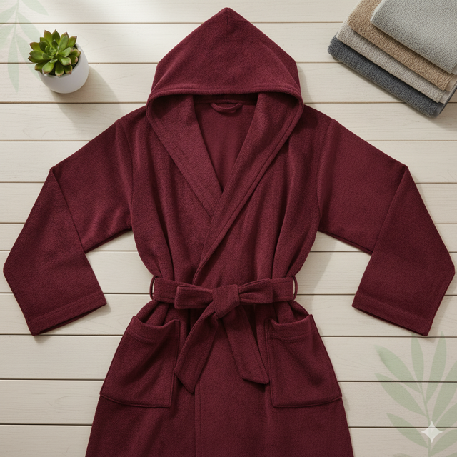 Thick terry cloth 450 GSM with attached hood for extra coziness. Shawl collar design with hood. Material: 100% cotton terry cloth. Colour: White, Charcoal, Navy, Burgundy. Sizes: S/M, L/XL. Care: Machine wash warm. Tumble dry medium. Features: Attached hood, two patch pockets, tie belt, ultra-plush, highly absorbent. Perfect for cold weather, post-bath warmth, lounging. Made in India.