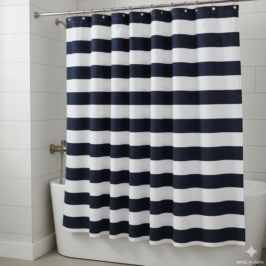 Polyester-linen blend 160 GSM with natural linen texture and water-resistant finish. Elegant drape, machine washable. Material: Polyester-linen blend. Colour: Natural Flax, White, Grey, Taupe. Sizes: Standard 72×72 inch. Care: Machine wash cold. Gentle cycle. Tumble dry low or line dry. Features: Rust-proof grommets, weighted hem. Requires liner for full waterproofing. Natural aesthetic for modern bathrooms. Manufactured in India.
