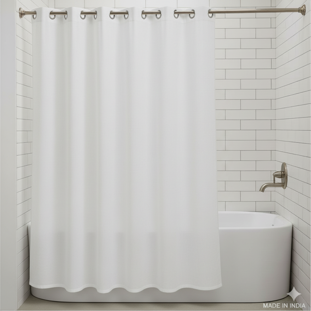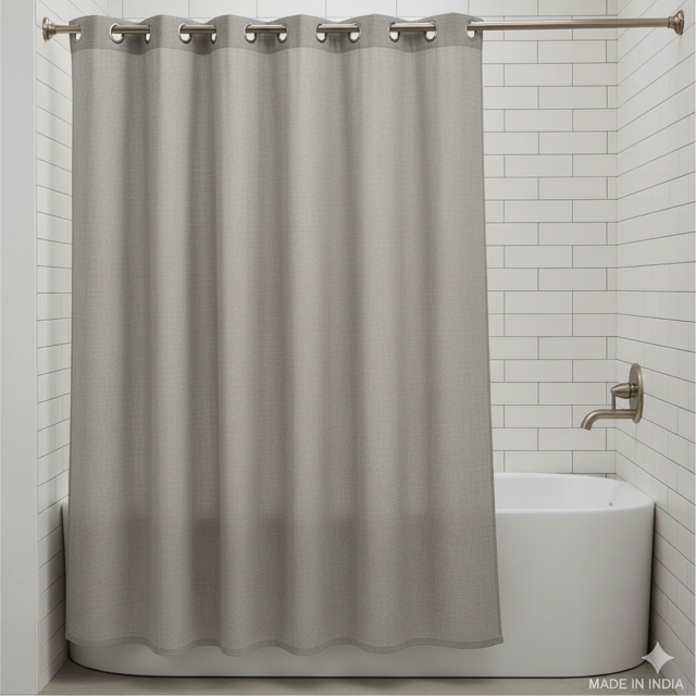 Polyester-linen blend 160 GSM with natural linen texture and water-resistant finish. Elegant drape, machine washable. Material: Polyester-linen blend. Colour: Natural Flax, White, Grey, Taupe. Sizes: Standard 72×72 inch. Care: Machine wash cold. Gentle cycle. Tumble dry low or line dry. Features: Rust-proof grommets, weighted hem. Requires liner for full waterproofing. Natural aesthetic for modern bathrooms. Manufactured in India.