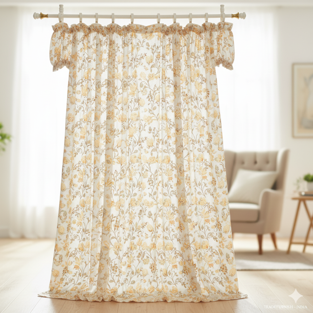 Premium silk blend 120 GSM, all-over ditsy floral print in warm sunset tones. Features short puff sleeves style heading, gathered waist, and side hooks for easy hanging. Material: Silk-Cotton blend. Colour: Coral pink base with pale yellow and green florals. Sizes: 7-9 feet. Care: Machine wash cold 30C, gentle cycle. Do not bleach. Tumble dry low. Iron on reverse side if needed. Fit: True to size, elegant drape with slight flare. Manufactured in India exclusively by TradeFurnish. Perfect for living rooms and bedrooms.