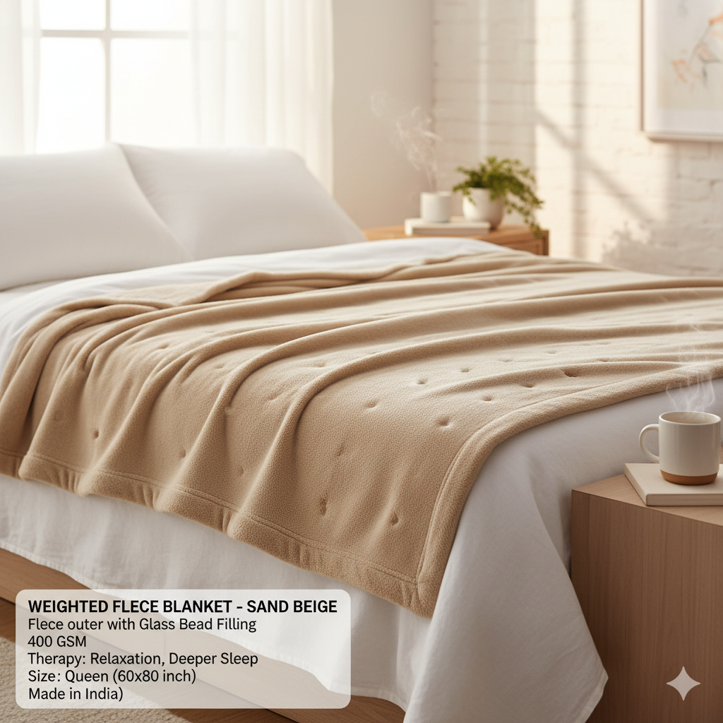 Calming weighted fleece blanket 400 GSM filled with glass beads for therapeutic benefits. Features soft fleece cover, evenly distributed weight, and cozy warmth. Material: Fleece outer with glass bead filling. Weight: 5kg or 7kg options. Colour: Sand Beige. Size: Queen (60×80 inch). Care: Machine wash cold. Delicate cycle. Tumble dry low. Therapy: Weighted design promotes relaxation, deeper sleep, anxiety relief. Perfect for stressed individuals, insomniacs, therapy-seekers. Manufactured in India.